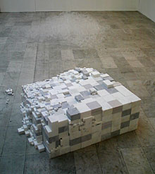In “sugar no sugar” marble and polystyrene cubes breaks into infinity transmuting into sugar-cubes. Each of these elements are different and familiar at the same time. They are all white and grey but in a different way and they have different consistencies while, in the other hand, sugar has a crystalline structure similar to marble. They can be visually confused. Touching and nominating the several elements you can divide them into ‘sugar’ and into ‘no sugar’. A writing, “…sugar sugar no sugar sugar …” on a wall recreates the same sculpture but in words. The whole sculpture crows and relates to itself from its micro-unity, “intelligent particles” or “little beings” as Fernando Melani would have called them as they also relate to each other always differently.